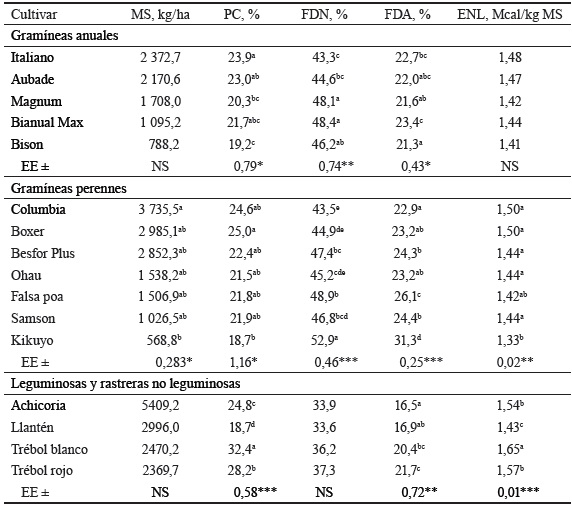 En el caso de las gramíneas perennes, se encontraron diferencias en todas las variables; el raigrás Columbia fue el de mayor rendimiento de MS, y el de menor rendimiento fue el kikuyo. El porcentaje de PC del raigrás Boxer fue superior al de las demás gramíneas perennes. El mayor valor porcentual de FDN se observó en el kikuyo; y en cuanto a la FDA, el raigrás Columbia mostró el menor valor y el kikuyo el mayor. La ENL varió entre 1,42 y 1,50 Mcal/kg MS para la mayoría de las gramíneas perennes, con excepción del kikuyo (tabla 3).
