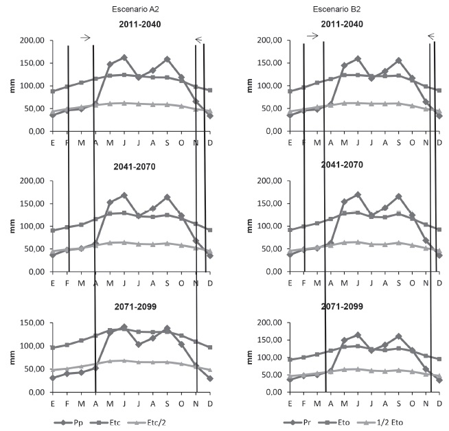 En el periodo base (1961-1990) se observó que, por lo bajos requerimientos hídricos de C. nlemfuensis y C. purpureus, estos se pudieron cultivar durante todo el año, ya que las precipitaciones fueron suficientes para suplir sus demandas evapotranspirativas. Sin embargo, M. maximus solo se cultivó durante 214 días al año: desde la tercera decena de mayo hasta la segunda decena de diciembre. En el caso de los pastos de corte, como C. purpureus, deben efectuarse cambios en el manejo para su aprovechamiento, como el uso de riego; ello significa incremento de los costos, por lo que se debería pensar en métodos de conservación, como el ensilado, para el periodo seco.