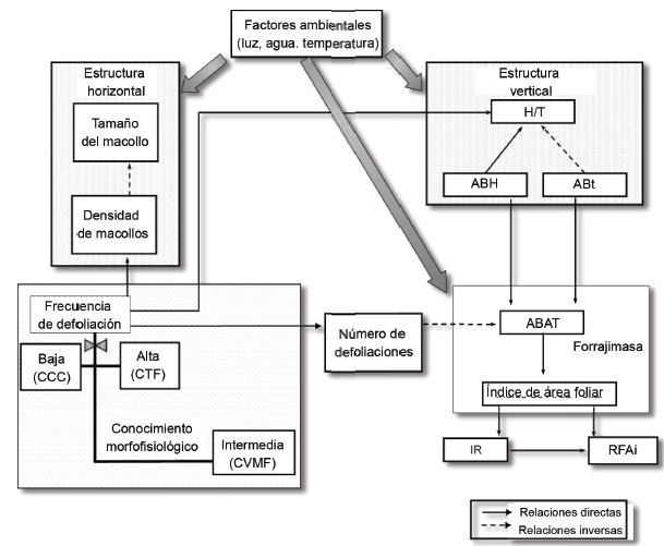 En la figura 3 se relacionan frecuencias de defoliación contrastantes (CCC y CTF) e intermedias (CVMF) con las variables de respuesta evaluadas, al considerar la estructura horizontal (densidad de macollos) y vertical de la pastura (H/T: indicador de calidad), la producción de biomasa aérea (ABAT), el crecimiento y la captura de la radiación (IAF), bajo el efecto de factores ambientales.