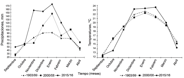 Cuando se comparan estos registros con las precipitaciones ocurridas para la estación de crecimiento de la pastura (septiembre de 2015 a abril de 2016), se observa que estas alcanzaron valores superiores a los mencionados. Todos los tratamientos acumularon un total de 837,2 mm de agua entre el rebrote y finales de marzo (figura 1), lo que significa un 27 y un 56 % más respecto a ambos períodos de comparación (2000/2008 y 1903/1999, respectivamente). Durante el ciclo de crecimiento de digitaria, se presentó una primavera con temperaturas menores a los promedios y más lluviosa; mientras que en el verano, las temperaturas fueron mayores y las lluvias levemente superiores al promedio histórico de la región.