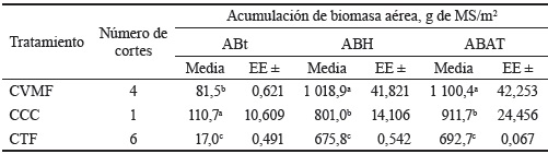 El tratamiento CCC presentó la mayor acumulación de tallos (ABt), mientras que para CVMF el valor de esta variable fue intermedio y menor en CTF (p < 0,05). Valores superiores de acumulación foliar (ABH) se obtuvieron con cortes al inicio de la senescencia (VMF), con diferencias significativas (p < 0,05), lo cual generó mayor biomasa aérea total (tabla 1).