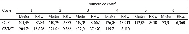 Teniendo en cuenta que el tratamiento CCC recibió un solo corte y, además, que este no se realizó cuando las condiciones favorecían el crecimiento de la pastura, solo se analizan los resultados para los tratamientos en que las frecuencias de defoliación se aplicaron dentro del periodo de crecimiento de la pastura (CTF y CVMF).