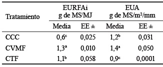Al analizar comparativamente los resultados, se evidencia que en CCC se registró la mayor RFAi, pero no se logró suficiente ABAT (CCC: 911,7 g MS/m2 y CVMF: 1 100,4 g MS/m2), lo cual afectó la EURFAi.