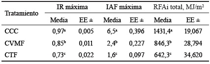 Hubo diferencias significativas para los valores máximos de IR e IAF de todos los cortes y para la RFAi total (tabla 4). El tratamiento CCC fue significativamente mayor en las tres variables. Al comparar los restantes tratamientos, CVMF mostró mejor comportamiento que CTF, al presentar mayores niveles relativos de IR, IAF máx, y RFAi total (p < 0,05).