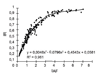 A partir de la serie de datos obtenidos y sin discriminar tratamientos, se obtuvo un modelo de regresión de tercer grado entre la IR y el IAF (R2 = 0,96; p < 0,001 tanto para el modelo como para los coeficientes, y menores valores de ECMP, AIC y BIC). En la figura 2 se observa el aumento progresivo de la intercepción a medida que se desarrollaba la biomasa aérea de la pastura, con consecuentes incrementos del IAF. Se alcanzó la máxima intercepción de la radiación (IR: 90-95 %), con IAF entre 4 y 6; posteriormente IR se estabilizó y se alcanzaron valores máximos de IAF (7).
