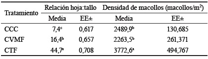 El tratamiento CCC mostró menor relación hoja:tallo (H/T), mientras que la mayor frecuencia de defoliación (CTF) impidió que la pastura llegara a generar una cantidad importante de varas florales (p < 0,05). Los incrementos en la frecuencia de defoliación mejoraron la estructura de la planta, al tener una mayor relación H/T (tabla 3).
