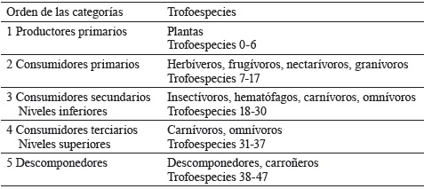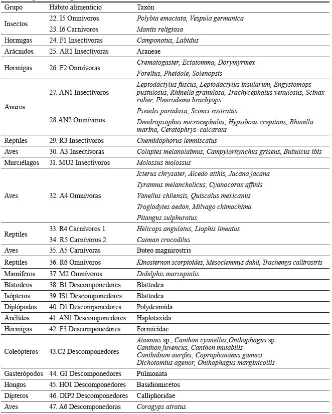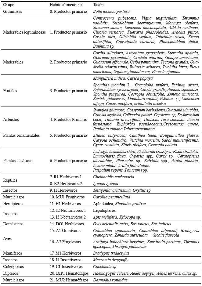Los hábitos alimenticios antes mencionados se agruparon en: productores (gramíneas, maderables, maderables leguminosas, frutales, arbustos, plantas ornamentales y plantas acuáticas), consumidores primarios (herbívoros, granívoros, frugívoros y polinizadores), consumidores secundarios (insectívoros, hematófagos, omnívoros y carnívoros), consumidores terminales (carnívoros y carroñeros) y descomponedores (hongos, formícidos, diplópodos, dípteros, coleópteros, blatodeos, isópteros, anélidos y gasterópodos). Al agrupar varias especies en una trofoespecie, se asumió como criterio la función trófica de estos, o sea, que compartan presa y/o predador en el sistema. En muchos aspectos, es fundamental considerar la función y conocer qué hacen las especies constituyentes, en lugar de evaluar si están presentes o no en el agroecosistema (Pedroza et al., 2016).