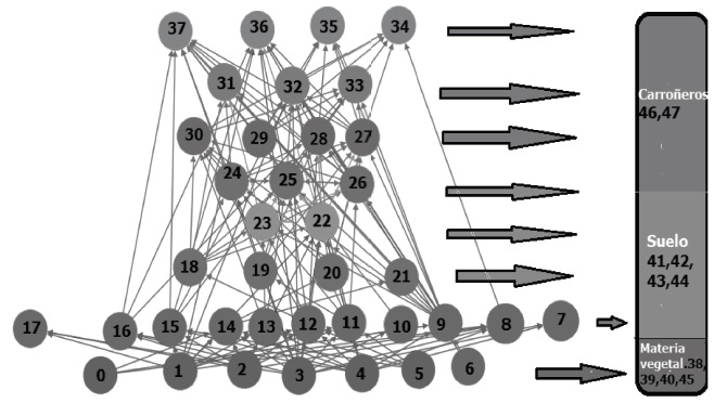 Las otras trofoespecies, en su mayoría, tuvieron en promedio de tres a siete predadores, con excepción de las trofoespecies 8 (reptiles herbívoros 2), 10 (murciélagos frugívoros), 21 (murciélagos hematófagos) y 31 (murciélagos insectívoros) que tuvieron solo una salida en el sistema. Estos resultados se analizaron mediante la red trófica del sistema y demostraron la importancia de cada trofoespecie. Igualmente, sobresalió la presencia del mamífero Didelphis marsupialis (fig. 3, trofoespecie 37) como especie reguladora de la comunidad, por presentar 11 presas.