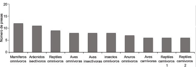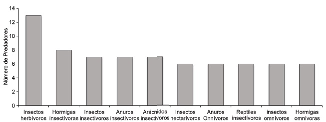 Las trofoespecies predadoras y presas más importantes, de acuerdo con el número de interacciones, se muestran en las figuras 3 y 4. Su extinción o exclusión pudiera romper las relaciones entre los conjuntos de especies, y ello puede perjudicar seriamente la integridad de los ecosistemas (Perfecto et al., 2014).