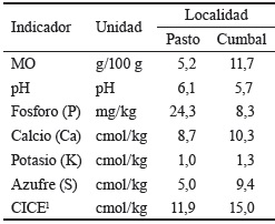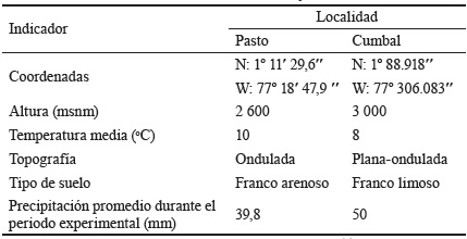 Ubicación y condiciones edafoclimáticas del área experimental. El estudio se desarrolló en los meses de julio y agosto de 2018, en dos fincas ganaderas ubicadas en diferentes localidades productoras de leche en el departamento de Nariño (Colombia), específicamente en los municipios de Pasto y Cumbal. Ambas localidades se ubican en regiones que corresponden a la zona de vida de bosque seco montano bajo (BSMB), según Holdrige (2000). Durante el estudio, las precipitaciones fueron bajas en ambas zonas. En la tabla 1 se detallan los datos referentes a la ubicación, así como las características ambientales, topográficas y edáficas de los sitios de estudio.