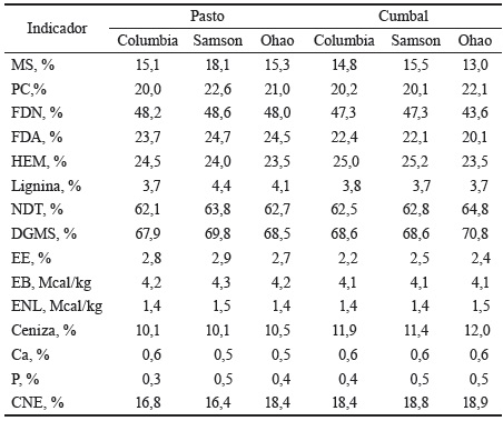 Composición química de la pastura. En los periodos de medición se tomaron submuestras de la pastura al momento de los aforos. Las muestras se secaron en un horno a temperatura de 65 ºC, durante 72 h; posteriormente, se enviaron al laboratorio de nutrición animal del centro de investigación Tibaitata de Agrosavia (Bogotá, Colombia), donde se realizaron los respectivos análisis bromatológicos para determinar: materia seca (MS); proteína cruda (PC); fibra detergente neutra (FDN); fibra detergente ácida (FDA); hemicelulosa (HEM); nutrientes digestibles totales (NDT); digestibilidad de la materia seca (DGMS), extracto etéreo (EE); energía bruta (EB); energía neta de lactancia (ENL); y ceniza, calcio y fósforo, mediante la técnica de espectroscopía de reflectancia en infrarrojo cercano NIRS (Ariza et al., 2017), con un equipo NIRS DS 2500-FOSS Analytical A/S, Dinamarca.