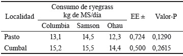 Consumo de materia seca (CMS). El consumo de MS fue similar en todos los cultivares para ambas localidades (tabla 5). Estos resultados no coinciden con los obtenidos por Riquelme y Pulido (2008), quienes reportaron consumos entre 15,6 y 17,6 kg de MS/animal/día; pero son superiores a los informados por Mejía et al. (2017), de 10,91 kg de MS/animal/día, cuando evaluaron este indicador en vacas Holstein en un monocultivo con praderas de kikuyo.
