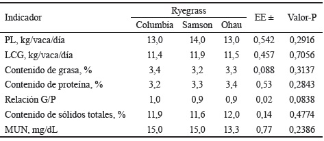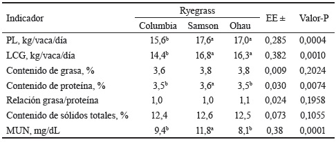 En la localidad de PAS hubo diferencias estadísticas (p < 0,05) entre los cultivares de ryegrass, en cuanto a la producción de leche (litros/vaca/día) y la LCG. Los cvs. Samson y Ohau fueron los de mayor LCG (16,8 y 16,3 kg/vaca/día). Por su parte, en la localidad de CUM no hubo diferencia en la producción de leche entre los tres cultivares (tabla 6).