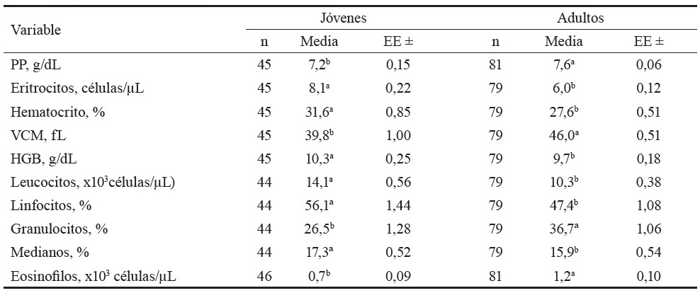 La prevalencia general de trematodos, determinada mediante el conteo fecal de huevos, fue de 40,21 % en bovinos adultos de los estados de Tabasco y Chiapas. Por otra parte, los componentes hematológicos mostraron diferencias entre los animales jóvenes y los adultos, pero no se observaron diferencias entre los animales parasitados con trematodos y los diagnosticados como libres de esos parásitos (tabla 1). Entre las categorías se observaron mayores valores en el volumen celular aglomerado (VCA), el número de eritrocitos, la cantidad de hemoglobina (HGB), el número de leucocitos, el porcentaje de linfocitos y de células medianas en los animales jóvenes; mientras que la proteína plasmática (PP), el volumen celular medio (VCM), el porcentaje de granulocitos y el número de eosinófilos fueron mayores en los animales adultos.