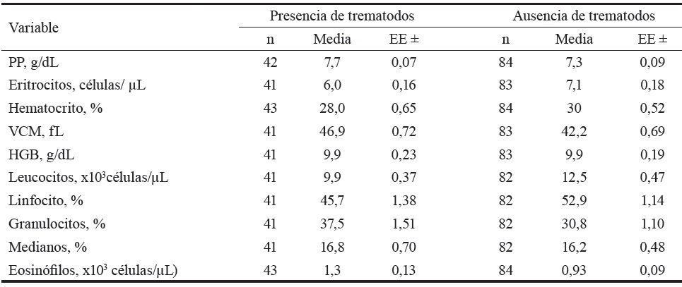La presencia de trematodos no afectó la composición hematológica en los bovinos muestreados (tabla 2). Los conteos de eritrocitos, hematocritos y eosinófilos fueron similares en los animales parasitados con trematodos que en los que estaban libres de ellos.