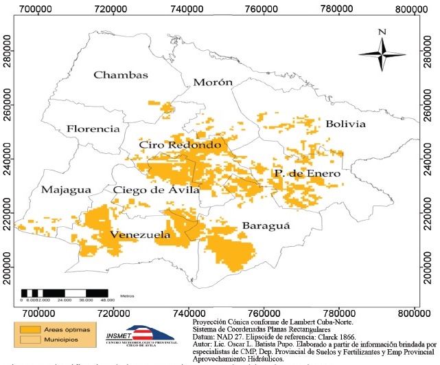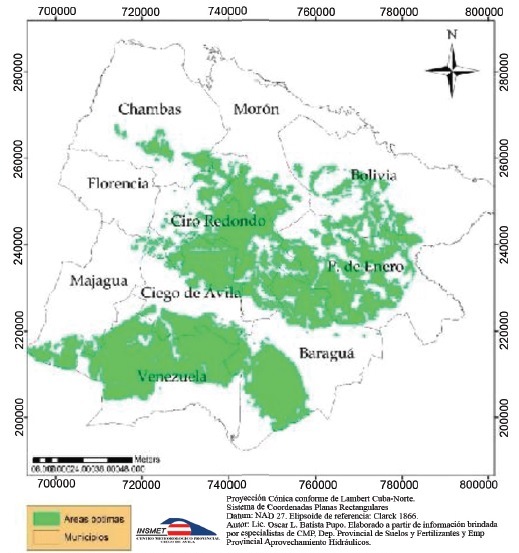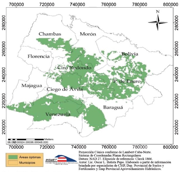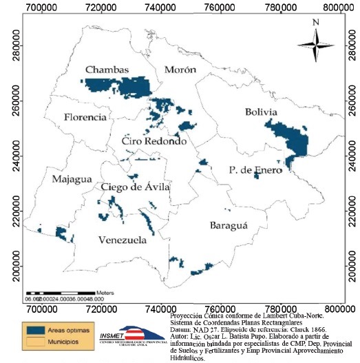Mapificación de los suelos. Se realizó según la necesidad de fertilidad y las características edafológicas y agroproductivas que exigen estas especies de cultivo. Se ordenó a partir de la localización de suelos con categorías I y II en cada municipio, lo que constituyó el elemento inicial de base de la mapificación general. La valoración agroproductiva responde a la realizada por la Dirección Provincial de Suelos de la Delegación de la Agricultura en Ciego de Ávila. Los elementos para la categorización agroproductiva I y II se corresponden con la clasificación de Mesa y Mesa (1985).