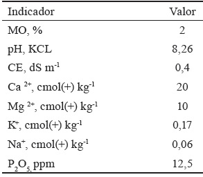 Características del suelo en el área experimental. Para conocer los indicadores del suelo, se tomaron muestras a 20 cm de profundidad mediante la técnica experimental de muestreo de forma cuadriculada (Almendros et al., 2010). Se procedió al secado y tamizado a través de una malla de 2 mm. Se determinó el pH mediante el método potenciométrico y la materia orgánica, según Walkley y Black (1934). El fósforo disponible se calculó por el método de Olsen et al. (1954) con espectrofotometría molecular (EDULST01-13). La capacidad de intercambio catiónico (CIC), cationes de cambio (Ca2+, Mg2+, Na+, K+) y capacidad de cambio de bases (CCB) se hallaron por el método de Mehlich (1984), modificado (NC- 65:2000) (tabla 1).
