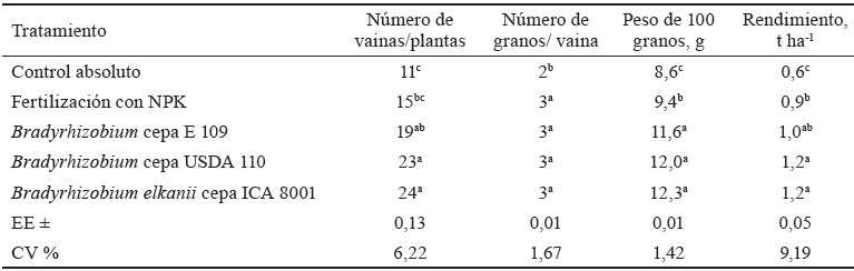 El peso de 100 granos y el rendimiento mostraron diferencias significativas con respecto al control, que presentó los menores valores, mientras que los mayores se obtuvieron en los tratamientos inoculados con las tres cepas de Bradyrhizobium (tabla 2).