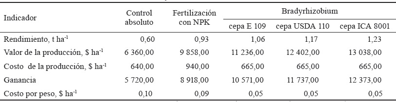 El cálculo económico del cultivo demostró que la inoculación constituye una alternativa para sustituir importaciones. Con esta técnica se obtuvieron ganancias de $ 5 720,00 (control absoluto) y $ 12 373,00 CUP (cepa ICA 8001) por hectárea (tabla 3).