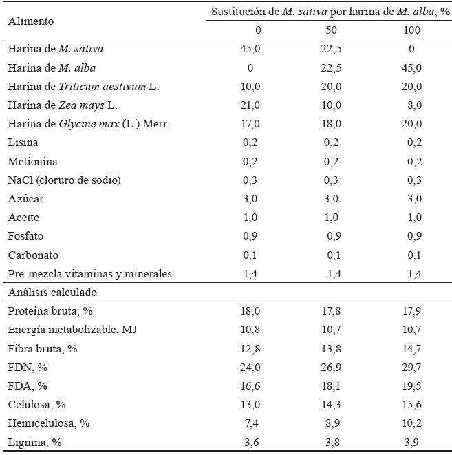 Se formularon y confeccionaron dos dietas, con diferentes niveles de sustitución de M. sativa (50 y 100 %) por harina de M. alba, variedad Yu 62, y el control con alfalfa (tabla 1).