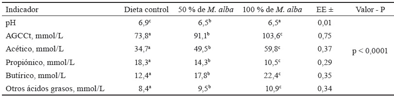 Una de las peculiaridades de la morera es la ausencia de taninos condensados (Savón et al., 2017), que precipitan las proteínas con interferencia en su digestibilidad (Legendre et al., 2017). Los factores antes expuestos influyen en que la degradación de la proteína y el almidón a nivel cecal sea menor, lo que posibilita la producción adecuada de ácidos grasos de cadena corta con estabilidad del pH (Lardot, 2018).
