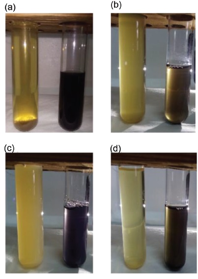 En las imágenes, el tubo de ensayo izquierdo corresponde al extracto crudo sin FeCl3, y el tubo derecho con 5 gotas de reactivo para probar el desarrollo de color, a)-Hojas de la canopea inferior, b)-Hojas de la canopea superior, c) Fruto y d) Frutos y hojas (tirso completo).
