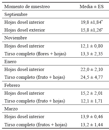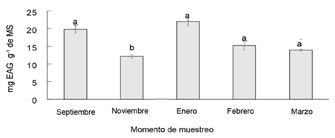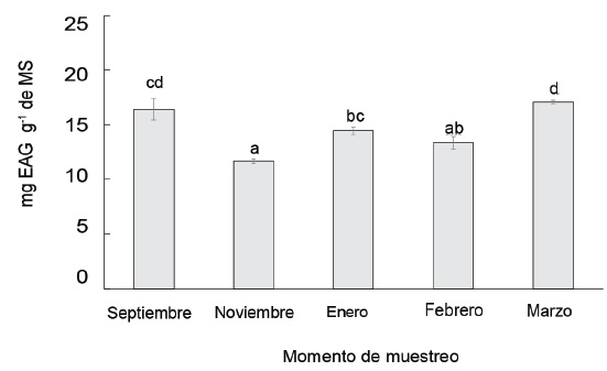 Las fluctuaciones estacionales en el contenido de taninos en las hojas vegetativas de E. angustifolia (plantas juveniles) se han abordado antes en la literatura (Zeng et al., 2009). Se encontró un ciclo estacional del contenido polifenólico en las hojas sombreadas de E. angustifolia desarrollado en la canopea inferior (figura 2). El promedio fue alto en la etapa vegetativa (septiembre) y de formación inicial de frutos (enero), con valores medios de 19,75 y 21,97 mg·EAG g-1 de MS, respectivamente, con diferencias significativas en los muestreos de noviembre, febrero y marzo.