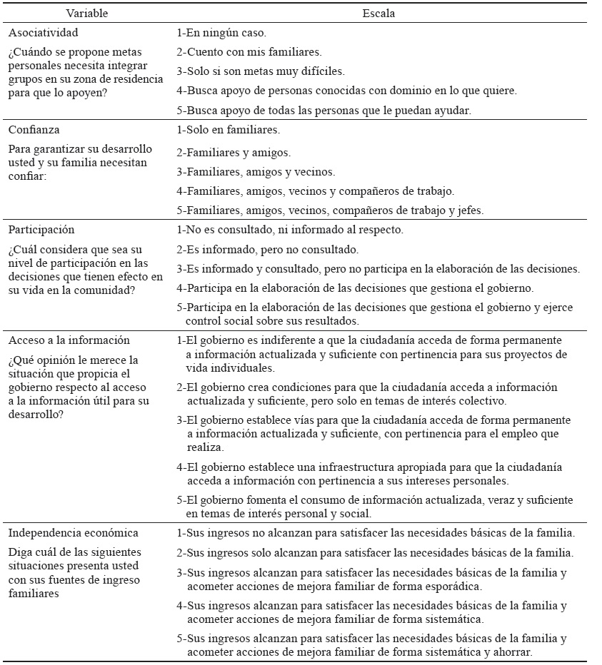 El capital social constituyó uno de los ámbitos de indagación, al considerar que representa un elemento de gran importancia en el que se debe incidir desde la administración pública, pues su promoción y uso adecuado representan una oportunidad de desarrollo para el municipio. Se evaluó a partir de componentes específicos que elevan el control social y la cohesión de la ciudadanía en torno al gobierno y su cuerpo de instituciones. En este tópico, se indagó mediante una encuesta que comprendió cinco aspectos: asociatividad, confianza, participación, acceso a información e independencia económica. Las variables seleccionadas para el estudio se incluyeron en un cuestionario estructurado, con una batería de posibles respuestas que, para su evaluación, se calificaron mediante una escala del 1 al 5 (tabla 1).