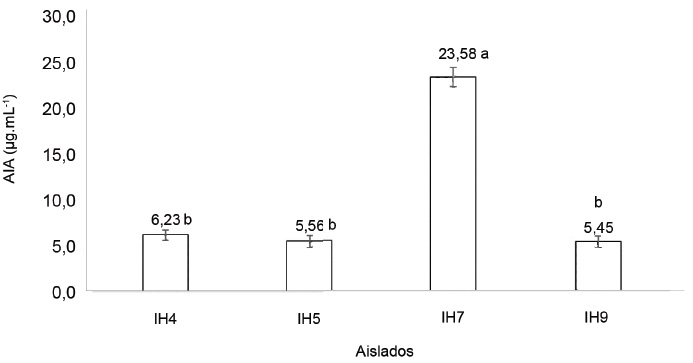 Producción de ácido indolacético (AIA). El ácido indolacético constituye una auxina natural producida por las plantas y una amplia gama de microrganismos del suelo. En la figura 1 se muestra la producción de AIA por los aislados bacterianos. IH7 mostró los valores más elevados con una concentración de 23,58 μg mL-1, mientras que IH4, IH5 e IH9 produjeron contenidos menores y sin diferencias significativas entre ellos.