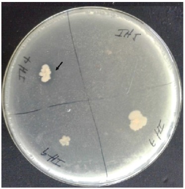 Solubilización de fosfatos. El aislado IH4 fue el único que mostró la capacidad de solubilizar Ca3(PO4)2, con un índice potencia de 48,25 % (figura 2). Esto coincide con otros autores quienes obtuvieron aislados rizosféricos de Bacillus spp. con eficiencias similares a las observadas en IH4 (Thanh y Tram, 2018). Por lo cual IH4 pudiera contribuir a elevar el crecimiento y desarrollo de cultivos. El empleo de bacterias solubilizadoras de fosfatos insolubles incrementa la disponibilidad del fósforo para los cultivos, que tiene funciones celulares vitales, al ser un componente estructural de ácidos nucleicos, fosfolípidos y moléculas de ATP, además de incrementar la producción de semillas y frutos y estimular el crecimiento de las raíces (Ranjbar-Moghaddam y Aminpanah, 2015).