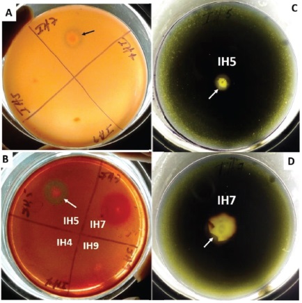 A: β-1,3-glucanasas y/o quitinasas de IH7, B: mananasas de IH5, C: amilasas de IH5, D: amilasas de IH7. Las flechas indican los halos de actividad.