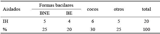 Aislamiento de las colonias bacterianas. Los resultados del proceso de aislamiento de colonias de bacilos se muestran en la tabla 1. Se obtuvo un total de 20 aislados entre bacilos esporulados (BE), bacilos no esporulados (BNE), cocos (C) con diferentes agrupaciones (diplococos, tetracocos, sarcinas, entre otras), así como otras formas, como actinomicetos. Se observaron cuatro aislados bacilares con capacidad de esporular (IH4, IH5, IH7 e IH9), lo que representó un 20,0 % con respecto al total de formas aisladas. El hecho de que se obtuvieron pocos aislados en número y diversidad, puede relacionarse con el pH ácido del producto IHPLUS ® (3,87), que afecta el crecimiento de Bacillus spp. Los aislados con capacidad de formar endosporas se seleccionaron para los ensayos bioquímicos.