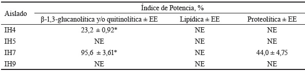Producción de enzimas. La tabla 2 muestra las actividades β-1,3-glucanolítica y/o quitinolítica, lipídica y proteolítica de los aislados. Los aislados IH4 e IH7 mostraron actividad β-1,3-glucanolítica y/o quitinolítica. Este último tuvo una efectividad mayor (95,55 %) que el IH4 (43,98 %). No se evidenció actividad lipídica en ninguno de los aislados, mientras que solamente IH7 expresó actividad proteolítica, con un índice de potencia de 43,98 %.