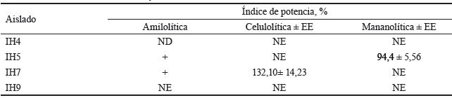 La actividad amilolítica, celulolítica y mananolítica de los aislados se muestra en la tabla 3 y en la figura 3. Los aislados IH5 e IH7 expresaron enzimas amilasas. En el caso de IH4 no se pudo determinar la actividad amilolítica debido a que este aislado secretó sustancias cerosas de naturaleza hidrofóbicas que cubrieron el medio de cultivo, por lo cual no fue posible revelar la actividad mediante la tinción del medio de cultivo. Con relación a la producción de celulasas y mananasas, IH7 mostró una actividad celulolítica notable (132,06 %) e IH5 fue eficiente en la actividad mananolítica con un índice de potencia igual a 94,44 %.
