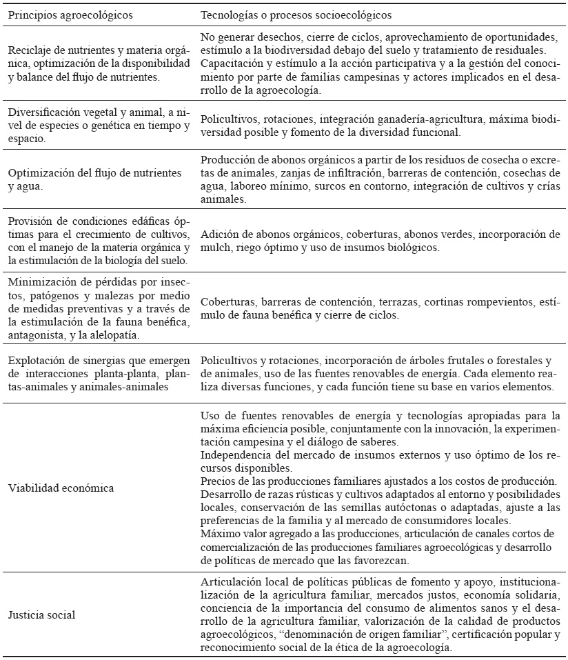 Estos principios, abordados por Altieri et al. (2015) y Gliessman (2016), se basan principalmente en procesos ecológicos. Sin embargo, Casimiro (2016) considera igualmente de vital importancia el complemento social asociado (tabla 1).