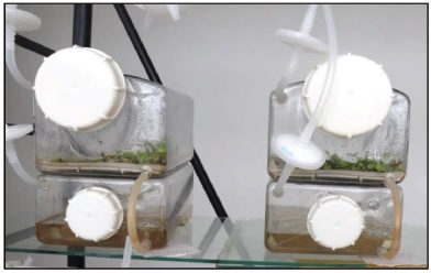 Cada sistema de inmersión temporal consiste en dos frascos superpuestos: uno para el crecimiento de las plantas y otro como reservorio del medio de cultivo (abajo). Ambos están acoplados con una manguera de silicona, de 6,0 mm de diámetro y 18,0 cm de longitud, a partir de los conectores ubicados en la parte inferior delantera de cada frasco. Además, se colocaron filtros hidrofóbicos de 0,2 µm para garantizar la esterilidad del aire dentro de los frascos (figura 1).