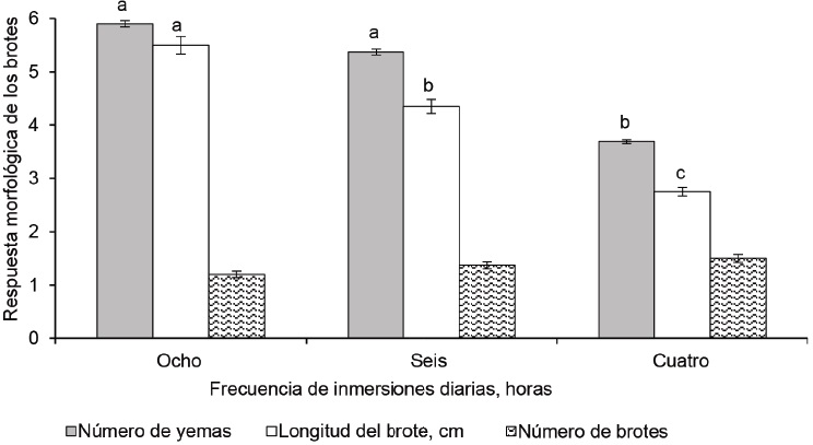 En este experimento también se pudo aumentar el número de yemas por brote (de 3,69 a 5,90) y la longitud de los brotes (de 2,75 a 5,50 cm), al cambiar la frecuencia de inmersión, de cuatro a cada ocho horas por día. Por el contrario, al disminuir el número de inmersiones se alargan las frecuencias o intervalos entre brotes, y se origina estrés en el material vegetal, lo que pudo haber estimulado la respuesta biológica de los brotes. Durante estas condiciones de estrés, es posible que el brote pase de una nutrición heterótrofa a mixotrófica, que estimule la producción de hormonas endógenas como el ácido abscísico y acelere los procesos de división y alargamiento celular.