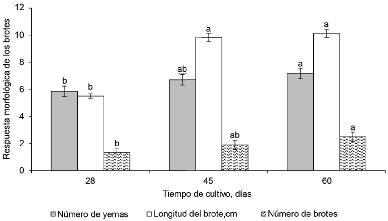 Efecto del tiempo de cultivo. Los brotes de morera se cultivaron en las mejores condiciones, determinadas en los experimentos previos. Se realizaron evaluaciones a los 28, 45 y 60 días de cultivo. Se realizó un subcultivo al medio de cultivo fresco, a los 28 días.