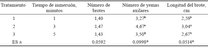 Al utilizar frecuencias de inmersión, cada seis u ocho horas diarias, con tres minutos de inmersión, se registraron valores promedio máximos en el número de yemas axilares, con diferencias significativas con respecto al tratamiento con frecuencia de inmersión cada cuatro horas (figura 3).