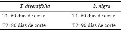Diseño experimental y tratamiento. Se aplicó un diseño de bloques completos al azar, con tres réplicas y dos tratamientos por especie (T. diversifolia y S. nigra), resultantes de dos edades de corte: 60 y 80 días en T. diversifolia; 60 y 90 días en S. nigra. Para el análisis del comportamiento, se diferenciaron dos épocas del año: altas y bajas precipitaciones. Cada unidad experimental estuvo conformada por seis arbustos, y se separó del tratamiento siguiente por un surco de arbustos que no se evaluaron, para controlar el efecto de borde (tabla 1).