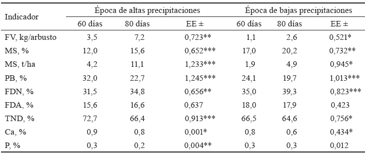 El contenido de PB presentó efecto de la edad de cosecha (p < 0,05), siendo menor al aumentar la edad de corte. Para T. diversifolia en la época de AP, los valores de PB disminuyeron de 32,0 a 22,7 % al incrementarse la frecuencia de corte, de 60 a 80 días. Mientras que, en el período de BP, la disminución fue de 24,1 a 19,7 %, respectivamente. Los resultados de PB en esta especie están en correspondencia con los informados por Lezcano et al. (2012), quienes encontraron valores de 29,8 % en plantas de 30 días, con respecto a las cosechadas a los 60 días (22,0 %). Sin embargo, es importante resaltar que, en esta investigación, las plantas con 60 días de edad presentaron contenidos proteicos superiores a 30 %.