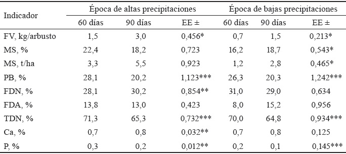 El rendimiento y la composición nutricional para T. diversifolia, a diferentes edades de corte y épocas del año se muestra en la tabla 2.