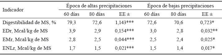 Se evidenció efecto de la edad de cosecha (p < 0,05) en los valores del fraccionamiento energético para ambas forrajeras (tablas 4 y 5). De manera general, se observaron mayores valores para EDr, EMr, y ENLr, a la edad de 60 días, en T. diversifolia como en S. nigra. Las cifras de fraccionamiento energético encontradas en este estudio para ambas especies, independientemente de la época de corte, fueron mayores que las informadas para algunos recursos forrajeros utilizados en el trópico. González-Guarin (2016), en el trópico alto de Colombia, registró 2,38 Mcal/kg MS de EDr para la especie S. nigra, a los 90 días de evaluada, en la época de AP. Este valor resulta inferior a las 2,98 Mcal que se hallaron en S. nigra en este experimento.