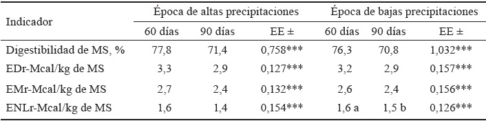 La EMr encontrada en ambas especies disminuyó (p < 0,05) a medida que aumentó la edad de corte (tablas 4 y 5). En cuanto a los valores de EMr encontrados a los 60 días para ambas especies, son mayores que los de pasturas mejoradas de Lolium perenne L (2,45 Mcal/kg/MS), con 36 días de rebrote (Villalobos y Arce, 2014).