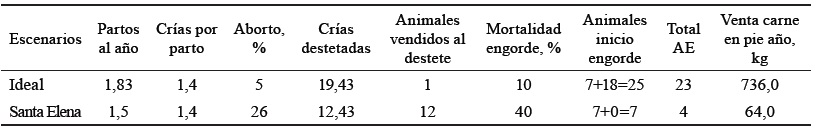 Para las crías se calculó el requerimiento de forraje hidropónico en base seca hasta llegar al criterio de venta: 32 kg para los escenarios B, C y D, mientras que en el A fue de 16 kg. De las crías para el escenario actual Santa Elena, se vendieron las 12 nacidas al año (fuera del hato modelo) inmediatamente al destete. Mientras, para el ideal, los 19 nacidos al año (fuera del hato modelo). De estos, se vendió 1 al destete y 18 se pudieron engordar, según la disponibilidad de forraje producido.