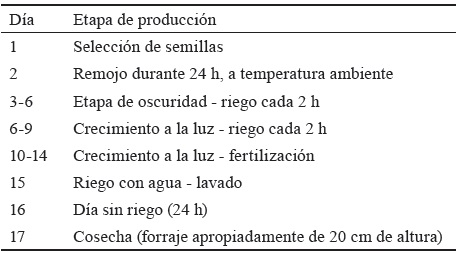 Cuatro bandejas equivalieron a 1 m2. Se sembró una dosis de 500 g de semilla seca, que una vez remojada durante 24 h aumenta su peso en 10 %. Así, la dosis de siembra por bandeja fue de 550 g de semilla remojada. La secuencia del cultivo se presenta en la tabla 2.