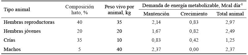 El hato modelo considerado para el estudio fue de 20 animales: hembras reproductoras (8), hembras de reemplazo (4), macho (1) y crías (7). Se mantuvieron las proporciones indicadas en la tabla 3. Para el macho, se asumió que el pastoreo cubrió su requerimiento energético de mantención. Para las hembras adultas y de reemplazo, se suplementó la energía de producción desde los 32 kg. En estas últimas se suplementó además, desde los 20 kg (peso de adquisición) hasta los 32 kg.