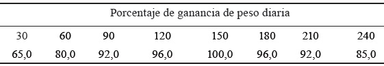 Se asumió una meta de 140 g diarios como el 100 % de la máxima ganancia de peso esperada en cabras, según lo informado con FVH (López-Aguilar et al., 2009). Los animales obtuvieron la energía de mantenimiento del pastoreo (3 a 5 h diarias).