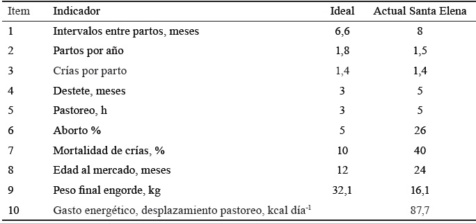El peso vivo de 32 kg por animal a la venta se logró a los 187 días, bajo los supuestos de la situación ideal y demanda energética. Este tiempo, unido a los 90 días a destete, produjo una vida útil de la cabra de aproximadamente 9 meses. Bajo el supuesto situación actual de Santa Elena (sin suplementación), las 12 crías anuales se deben vender inmediatamente al destete, y los siete cabritos del hato se engordaron solo a base de pastoreo, por lo que solo se alcanzó un peso a la venta de 16 kg en dos años.