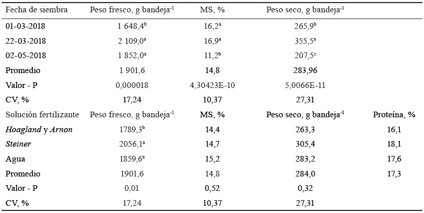 Rendimiento y materia seca. Los resultados de peso fresco, seco y porcentaje de MS del FVH de Z. mays mostraron un efecto significativo de la época de cultivo (tabla 6). Al analizar el peso seco en las tres fechas de siembra evaluadas, el mayor rendimiento se alcanzó en la del 22 de marzo con valores alrededor de 355,5 g bandeja-1. Este ciclo duró 17 días, mientras que los otros 13 y 16 días, respectivamente. La duración del ciclo de crecimiento se relaciona, como para cualquier especie vegetal, con el clima reinante, especialmente con la temperatura y la radiación solar.